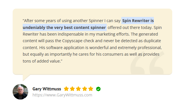 "Spin Rewriter has greatly increased my productivity, allowing me to automatically spin content faster." Being able to spin the content into unique articles without much rewriting has made my process so much faster and efficient with Spin Rewriter. - Rod Davison, GolferOnFire.com, a proud Spin Rewriter Gold member.